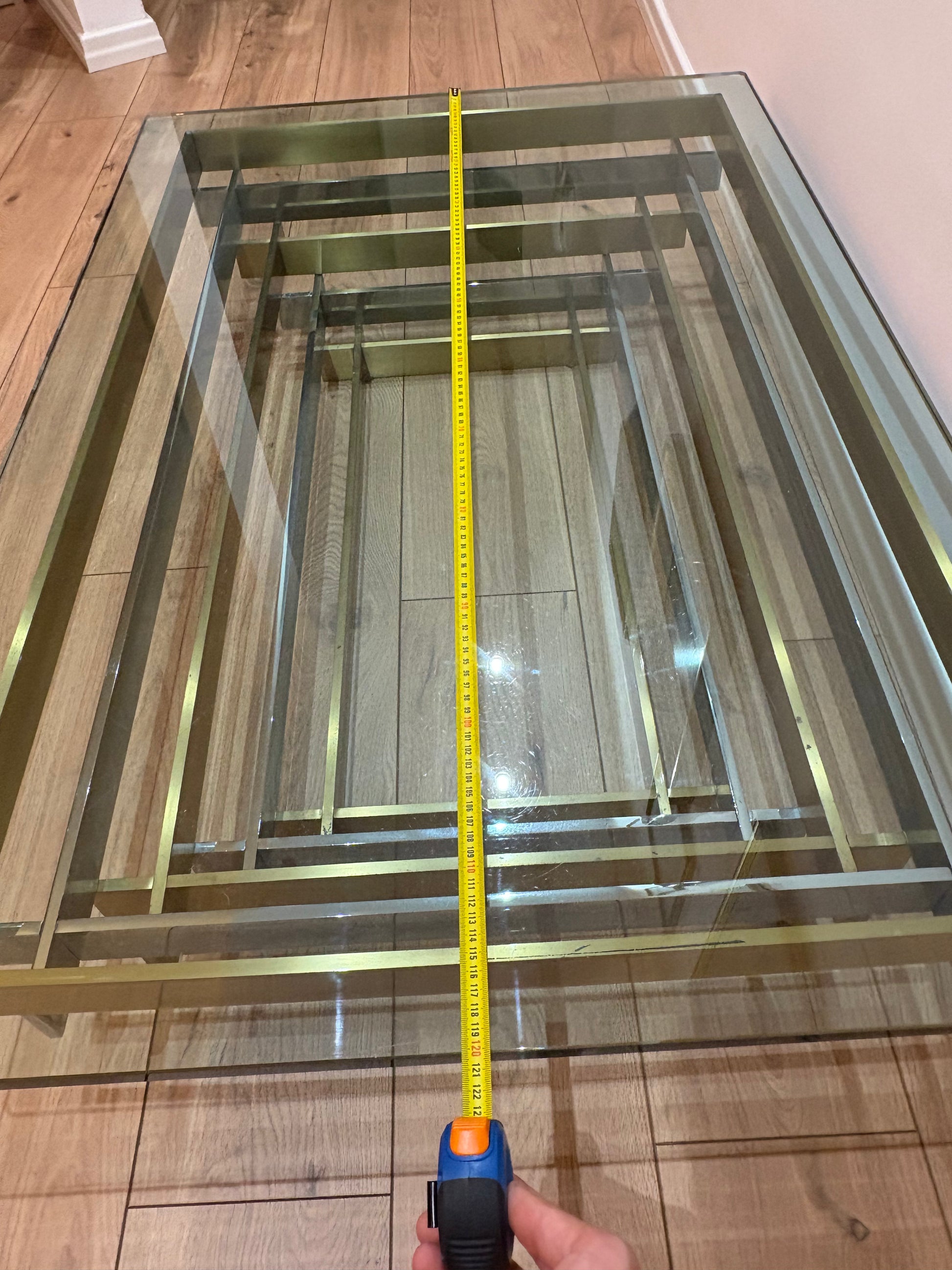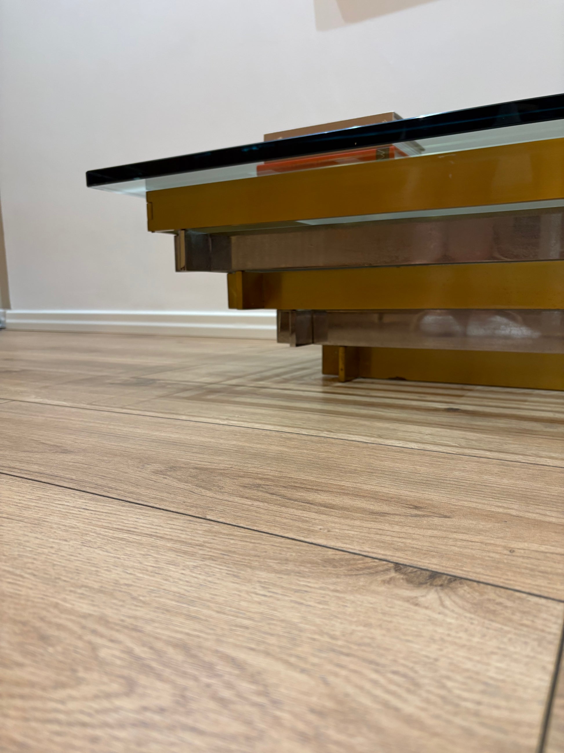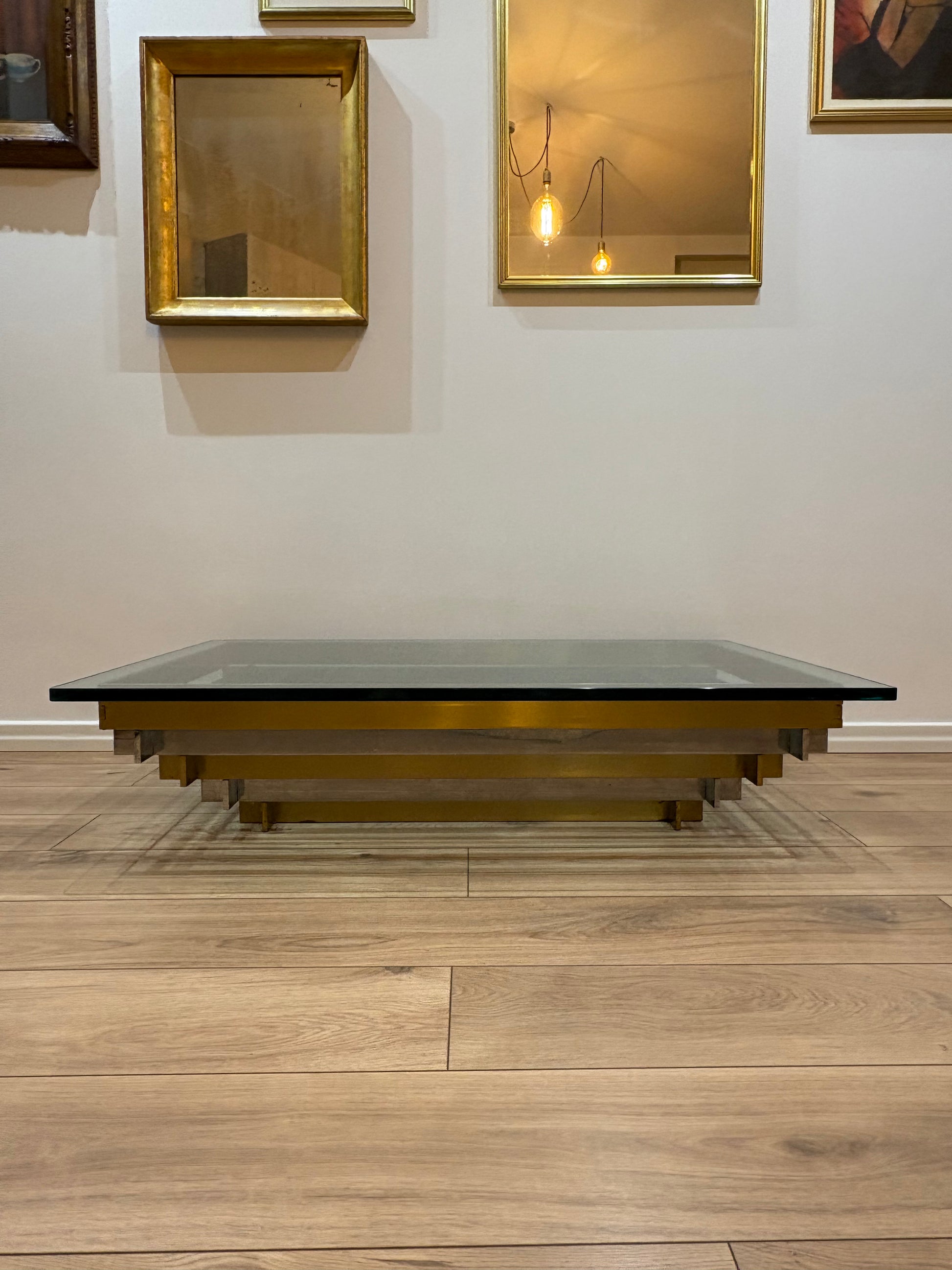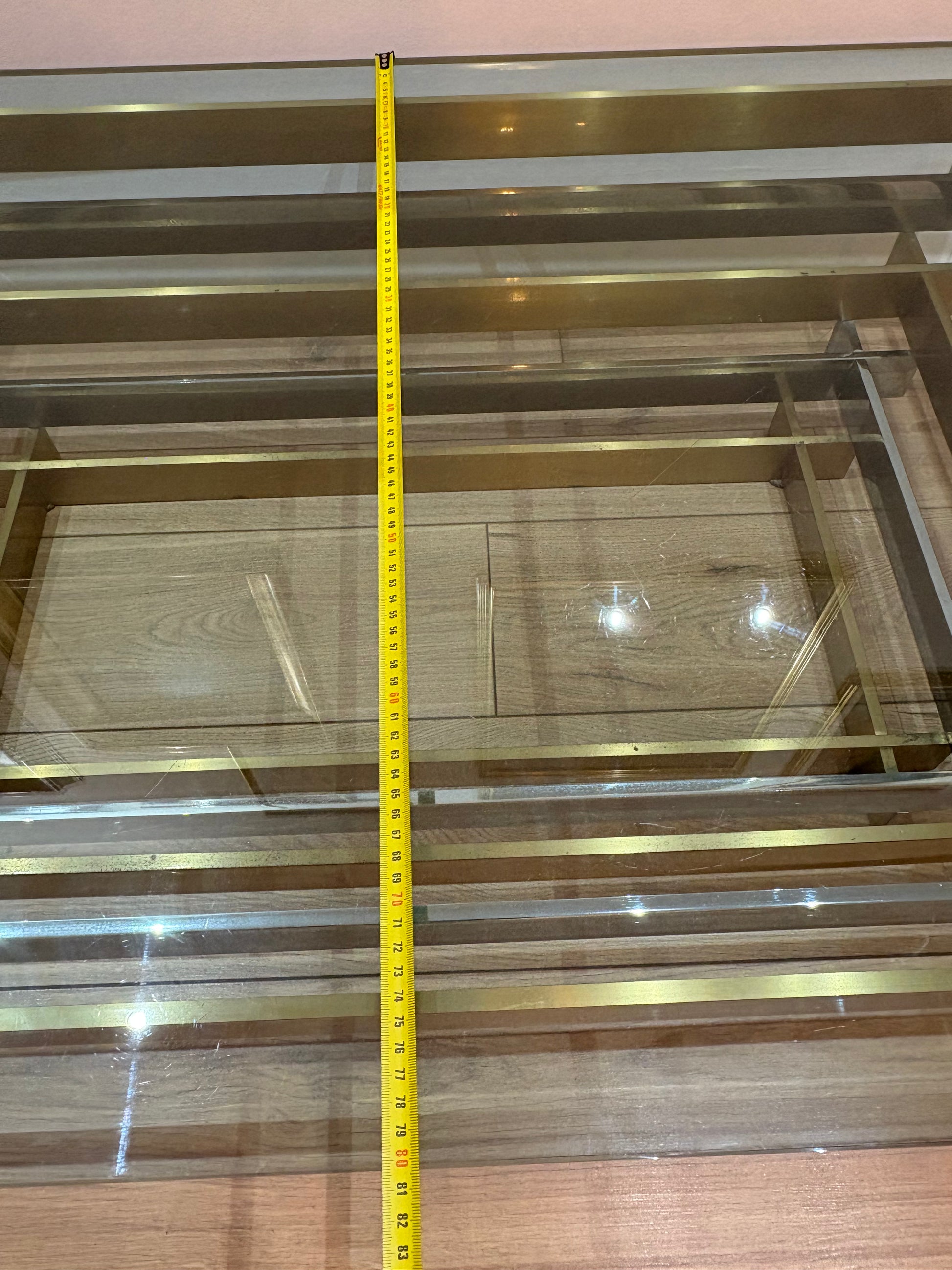 A striking vintage coffee table, where crystal glass meets the elegance of golden and white brass. Its geometric frame reflects light like a modern sculpture, giving depth and character to any space. More than a table, it is a statement piece – solid, bold, and timeless. Measuring 120 x 80 cm, this rare design treasure brings sophistication and charm to your home.