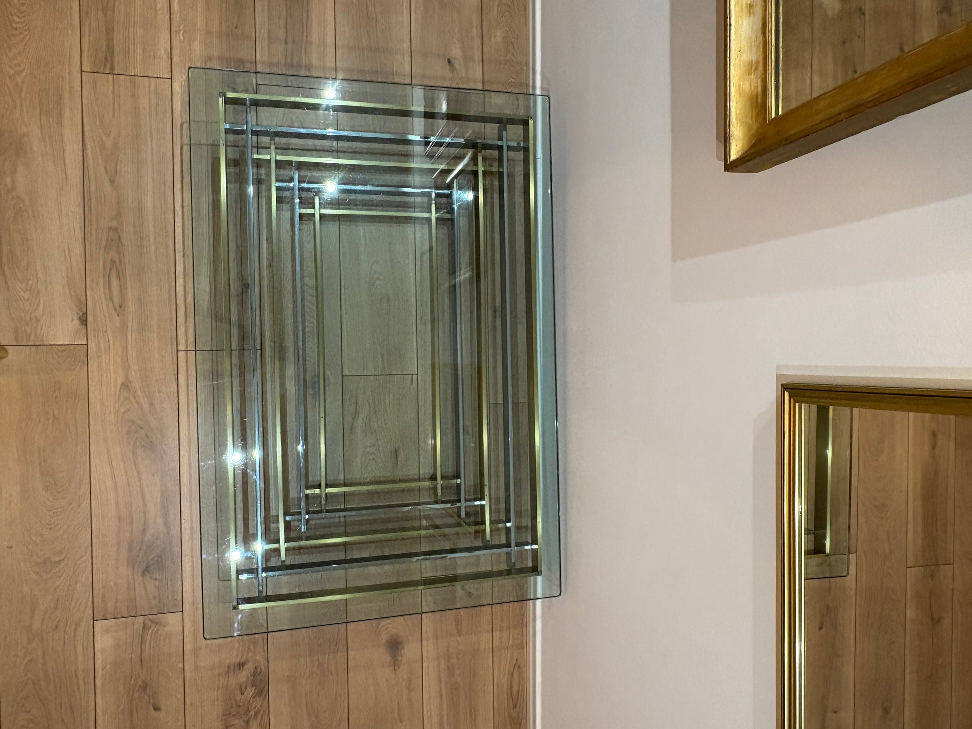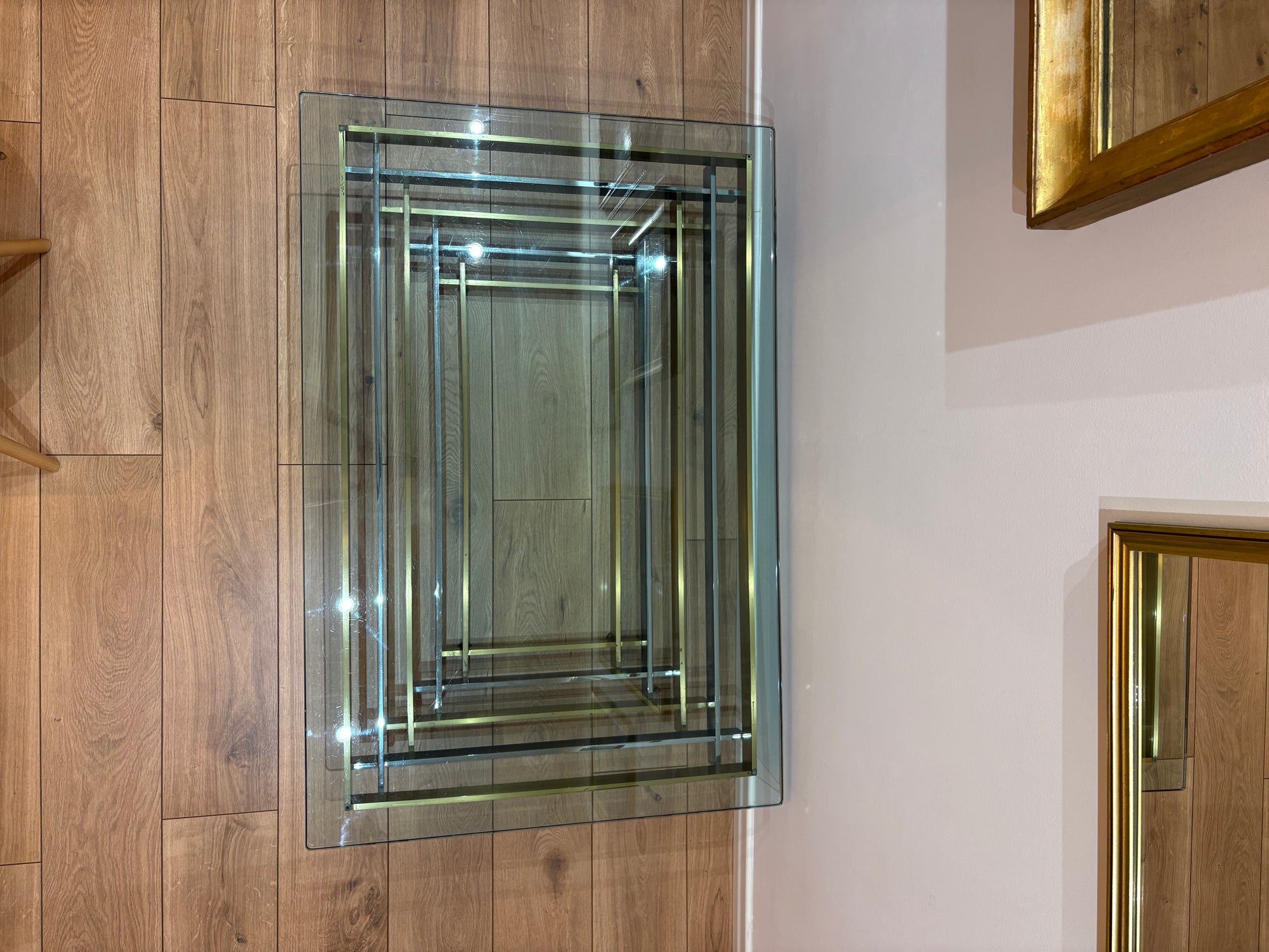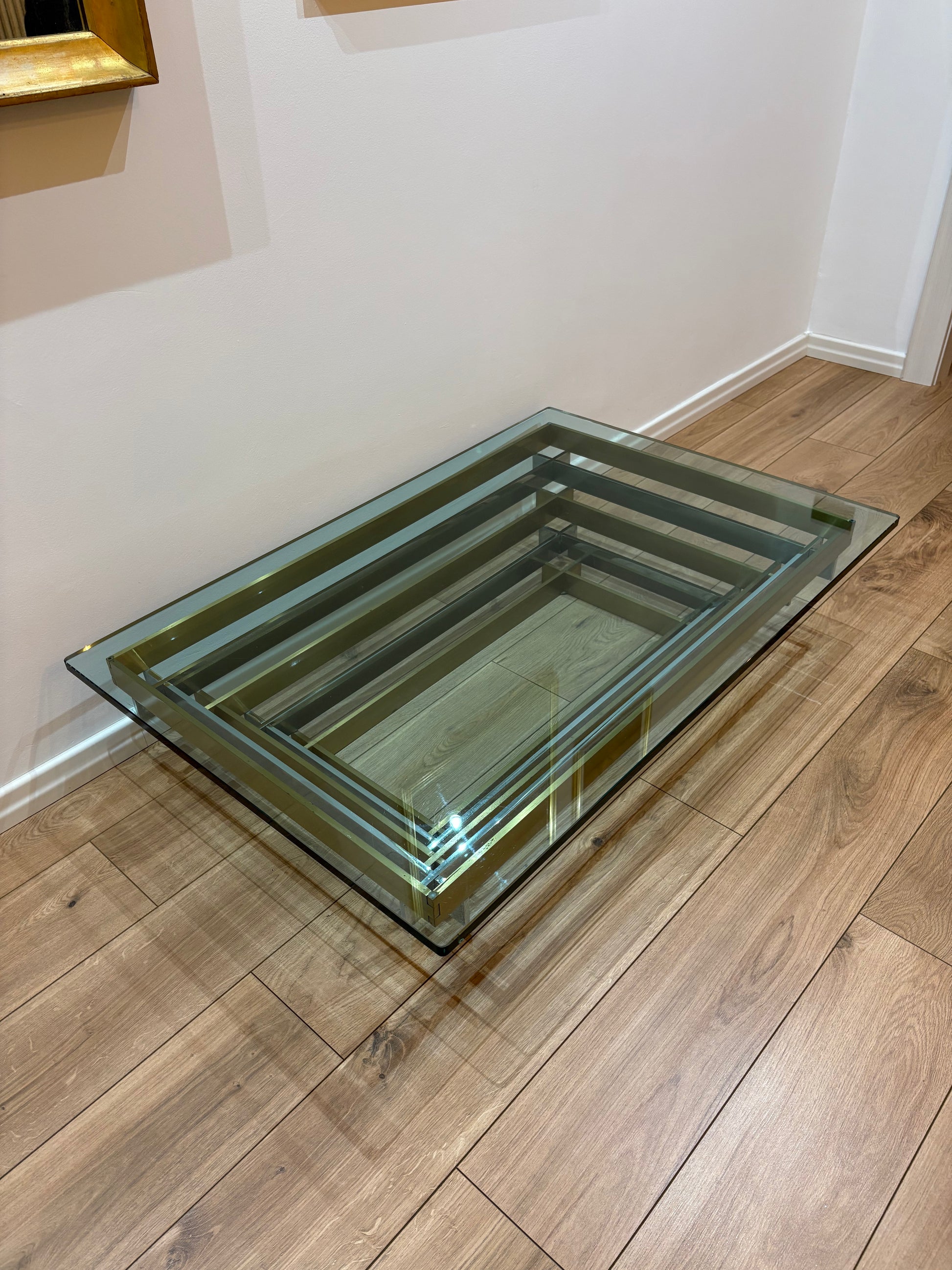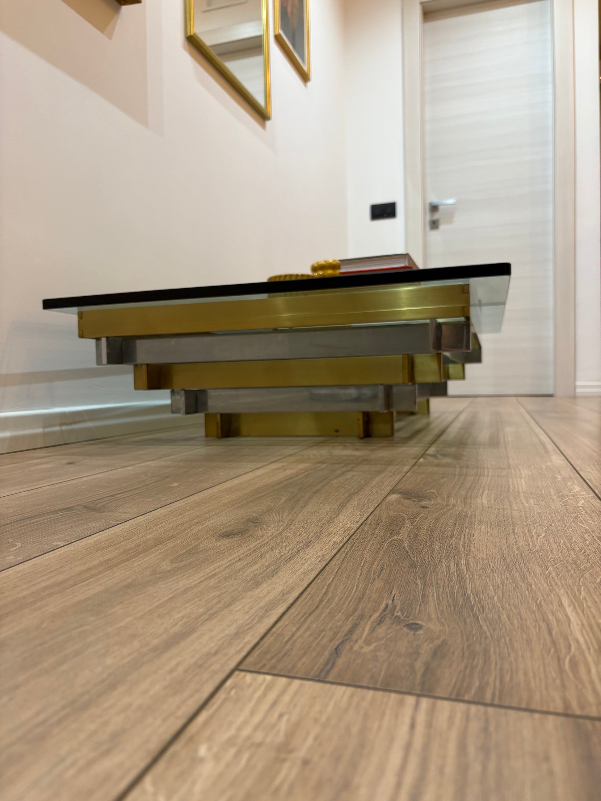 A striking vintage coffee table, where crystal glass meets the elegance of golden and white brass. Its geometric frame reflects light like a modern sculpture, giving depth and character to any space. More than a table, it is a statement piece – solid, bold, and timeless. Measuring 120 x 80 cm, this rare design treasure brings sophistication and charm to your home.